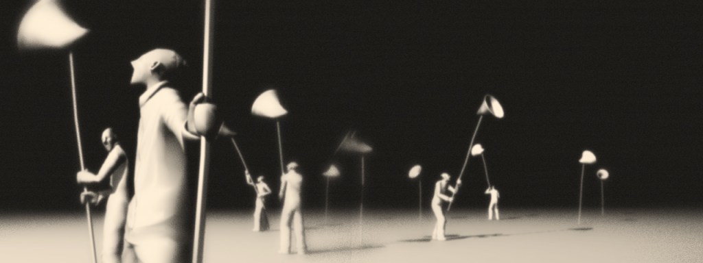 The animation depicts fleeting moments of interaction between two characters – a woman pushing an empty wheelchair, and a sound seeker searching for an unknown sound.