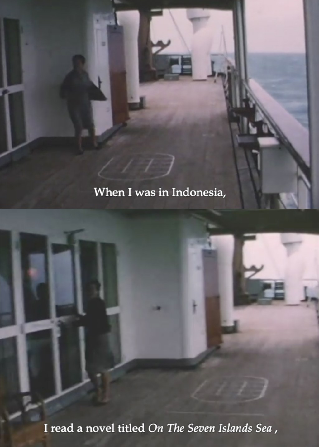 Royal Interocean Lines, a Dutch shipping company based in Hong Kong, operated vessels bearing the “TJI” prefix during the 1960s exodus of Chinese Indonesians to China via Hong Kong. Law’s work combines archival footage, communist spy films, and Michael Rogge’s personal videos with fragmented diasporic memories, retracing the sea route from Tanjung Priok to Tsim Sha Tsui. The monologue, performed by Jonathan Jonathan—a naturalized Indonesian of Chinese descent without a Chinese surname—reflects on displacement and identity.
